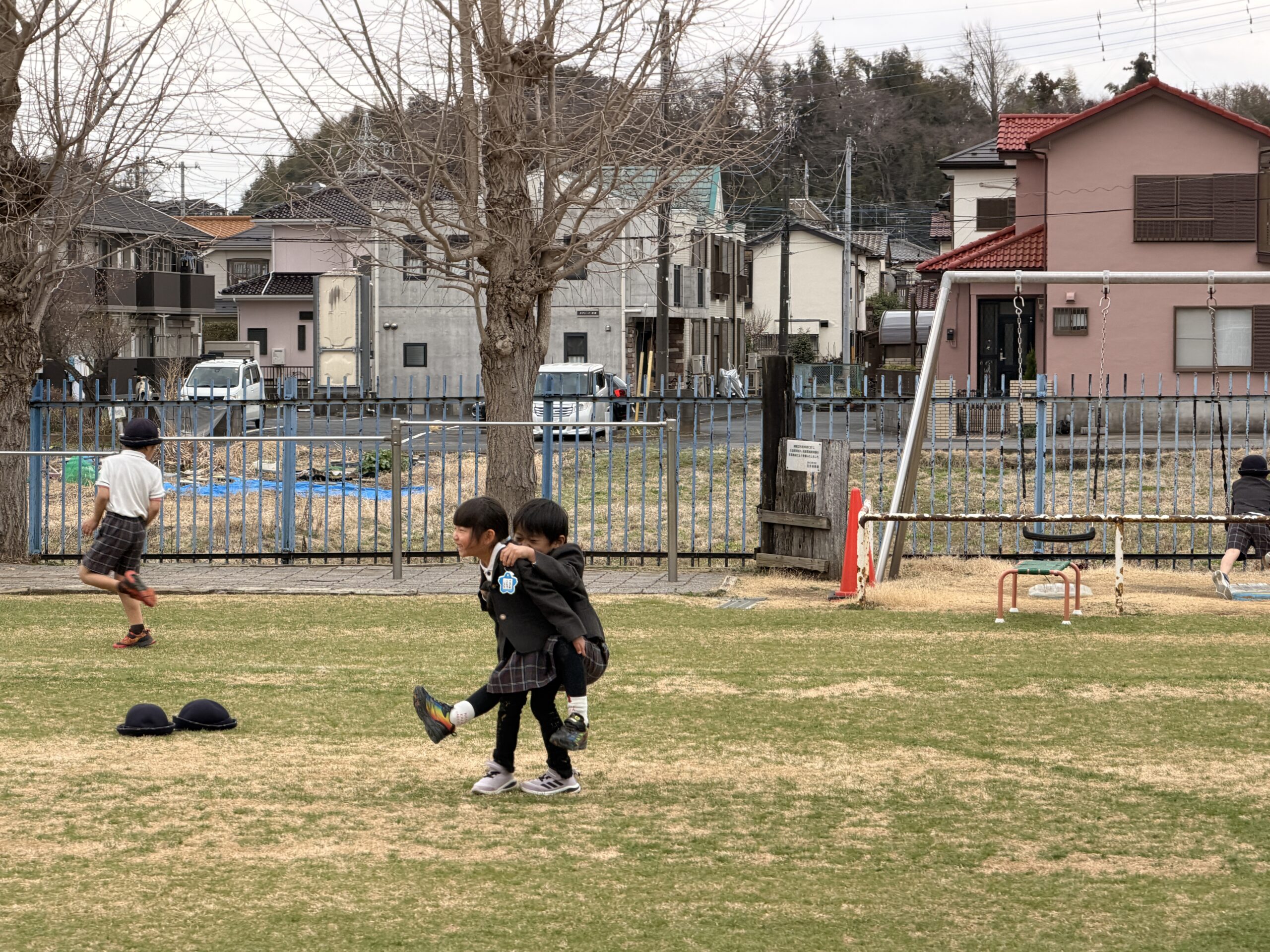 バスを待ってる二人の写真。年長の女の子と年中の男の子。二人でずっとおんぶしあっていて、なかなかうまくいかなくて、ゲラゲラ笑ってる。そんな日常のひとコマがたまらなく可愛くて愛おしい。ありがとう。