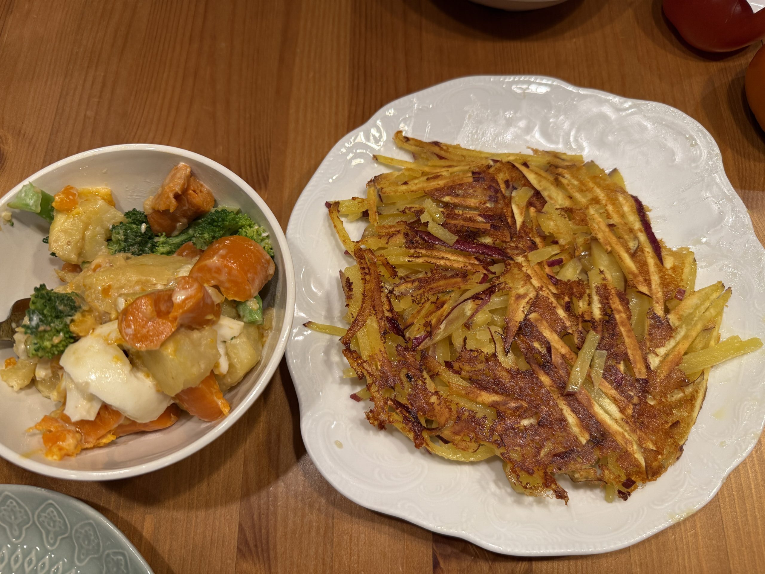 ポテトとポテト 2025.10.01 夕飯の準備が遅くなって、ぱぱっと作れるもの、、うーんうーんいつも食材があるようなないような、、状態からダッシュで作る。ゆで卵がたいてい作ってあるので、茹で野菜(レンジでチン)と和える。そしていただいたさつまいものガレット。茹で野菜というのはじゃがいもとにんじんとブロッコリー、ポテト祭りになった。家人はイヤな顔をして自分だけシャケを温めていた。。