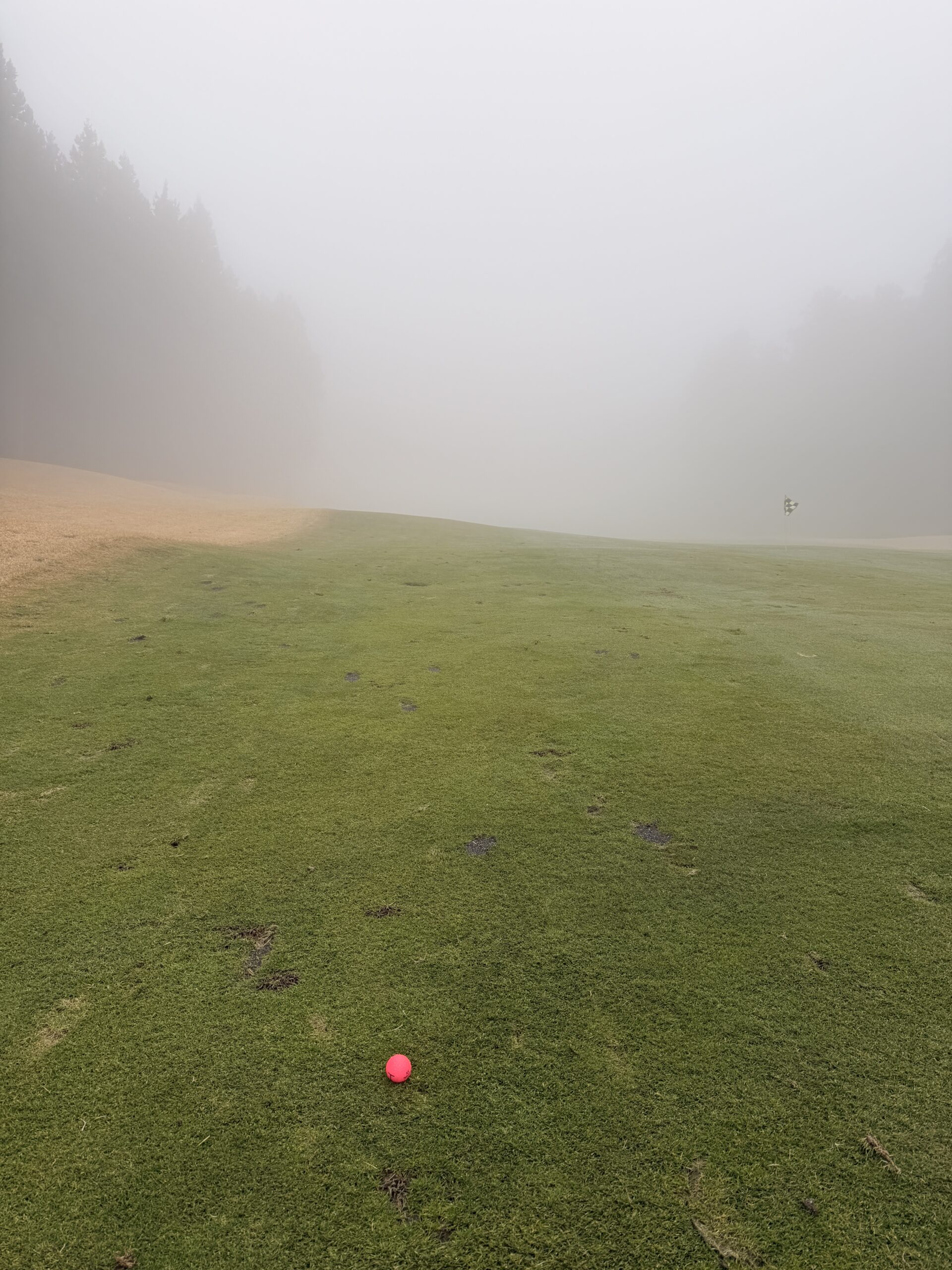お天気が心配だったけど、昨夜からの雨は止み、霧のゴルフ場。午前中はそれでも曇空。午後は完全に霧に包まれた。
