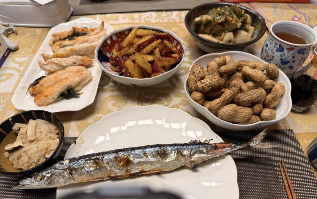 長野から送られてきた松茸(松茸山を持っているという方!)で松茸ご飯、大学芋、さんま、ささみにしそとチーズを挟んであげたもの、里芋の和え物。旬の夕ご飯。
