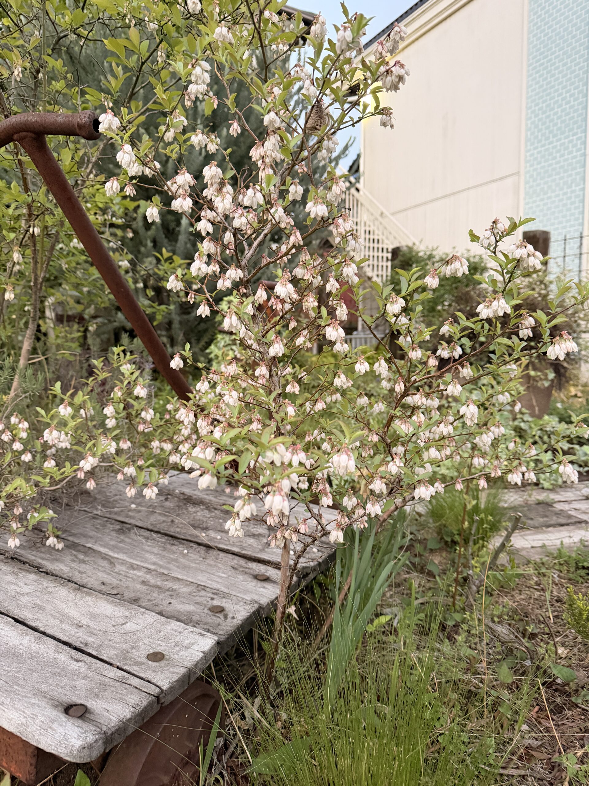 少し早めに帰宅してバラの消毒をした。ちょっと見ないうちに、またバラゾウムシに可愛い新芽ちゃんがちゅうちゅう吸われて枯れている。もー!ー腹立たしい!今はブルーベリーが花盛り。