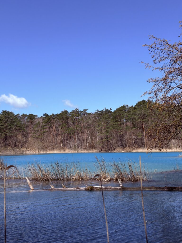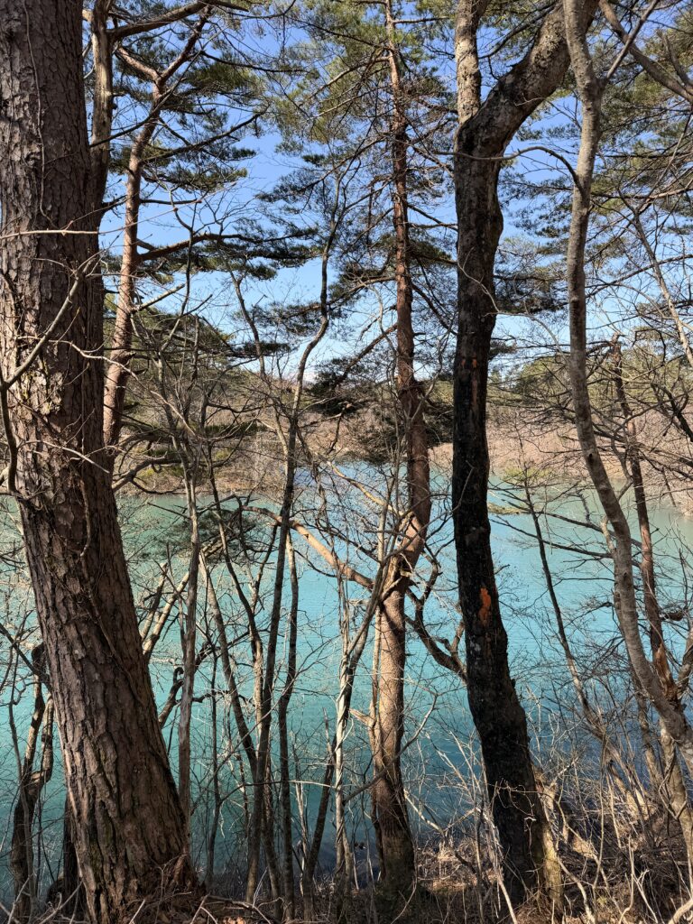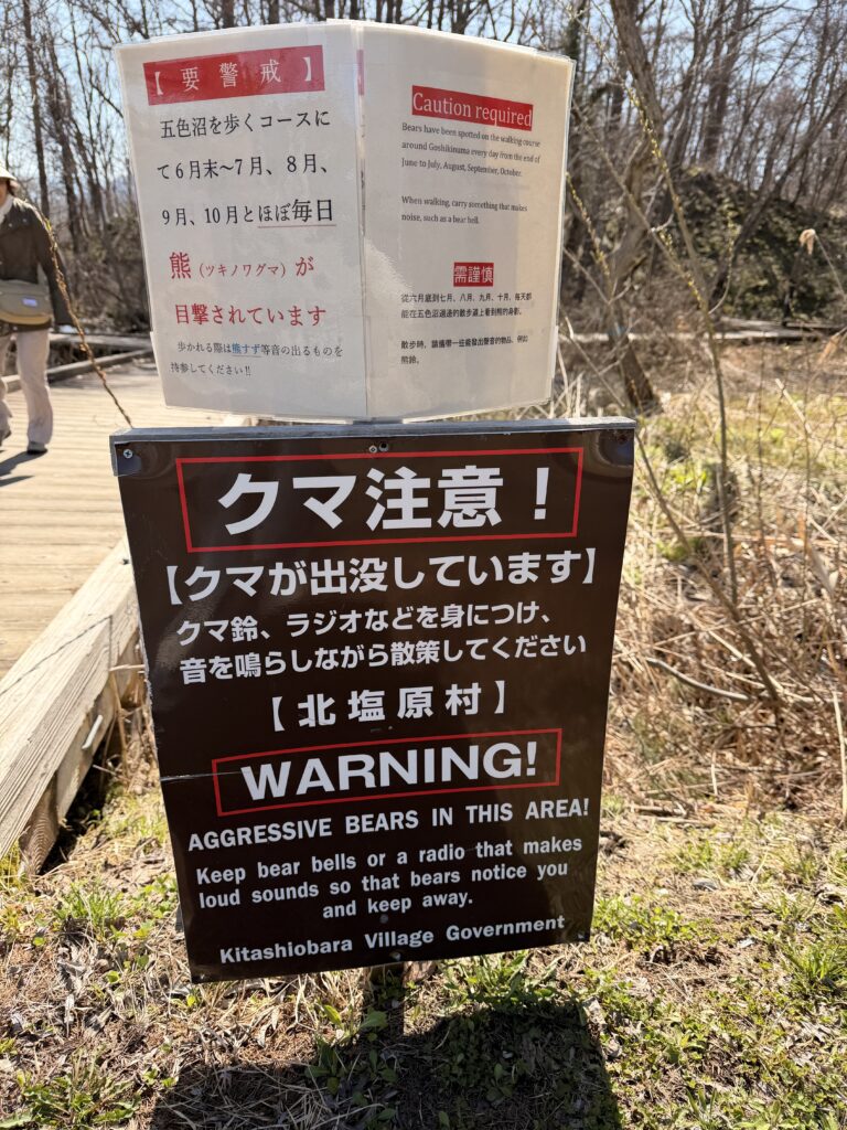 朝、早めにチェックアウトして、五色沼の散策をする。この夫婦はすごくよく歩くので覚悟してきた。約4キロのハイキング道をゆく。寒い。雪が溶けきらないわけだ。出る時暑いくらいだったから羽織るものも薄い。ダウンが必要な寒さだ。寒いからどんどん歩く。きれいな水の色に引き込まれそうになる。落ちないように、、自然の美しさに息を呑む。そこかしこに「毎日、熊の目撃情報あり」と書かれている。